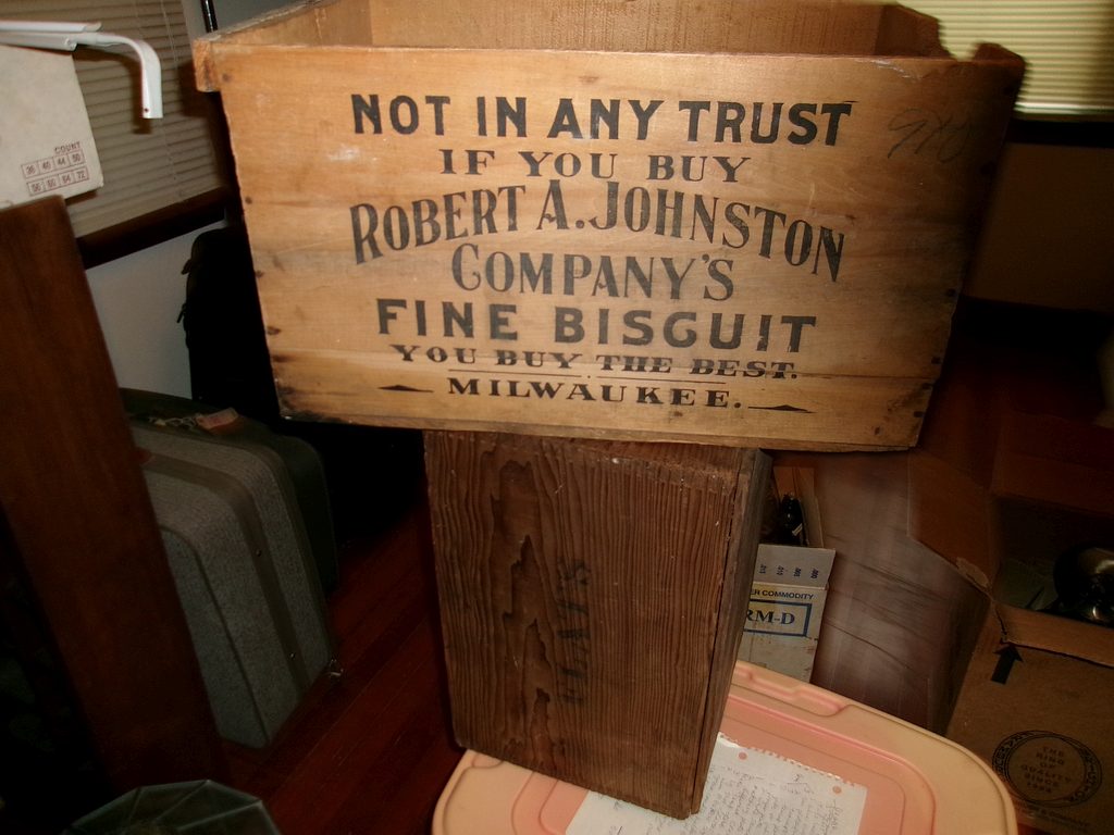 Wood biscuit box; Wood soap box; Wicker baskets; Kerosene lamps