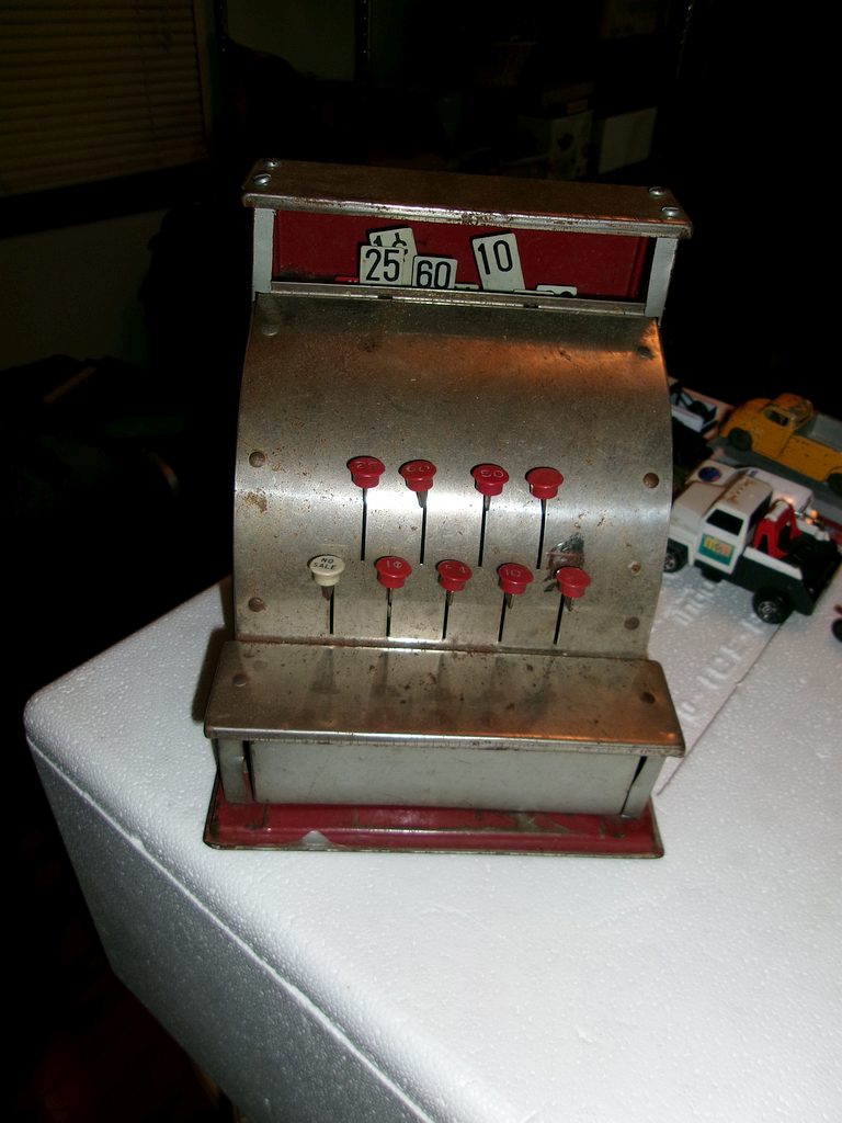Wyandott truck & trailer; AFX train set; Cash register; Wagon gear