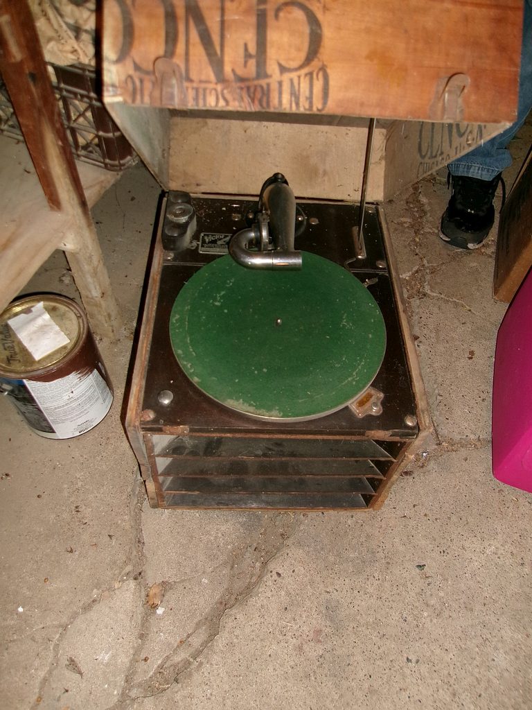14- 1 gal glass jars; Fruit jars; Victrola in the box; 4 gal stone crock; 1 gal stove jug