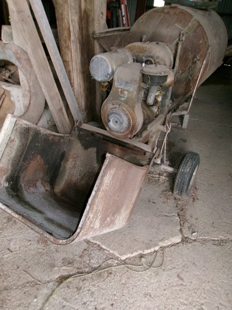Vintage cement mixer w/WI engine; 18.4-38 duals; Cast iron wheels; Mdl "A" jack